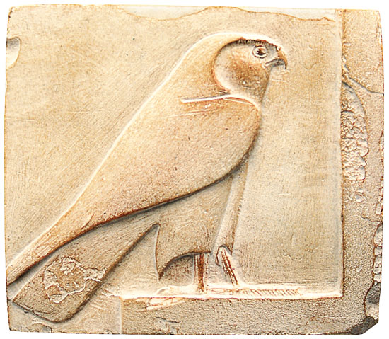 Solche Reliefs dienten im alten Ägypten als Lehrobjekte, mit denen die Bildhauer ihre Kunstfertigkeit unter Beweis stellen mussten. Original: Metropolitan Museum of Art, New York. Ptolemäer-Zeit, um 150-200 v. Chr., Kalkstein. 'Horus-Falke': Als König der Lüfte ist der Falke das heilige Tier des Königs der Götter, Horus. Er ist der Gott, der mit seinen Schwingen die Erde beschützt. Polymeres ars mundi Museums-Replikat, von Hand gegossen. Mit Aufhängevorrichtung. Format 17 x 15 cm.