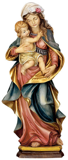 In reiner Handarbeit wird sorgfältig für jedes Objekt das geeignete Holz ausgewählt, in überragender Qualität geschnitzt und anschließend mit viel Liebe zum Detail von Hand bemalt. Die Rose ist ein uraltes Zeichen für Schönheit, Schmerz und Liebe. Die Rosenmadonna ist eine der beliebtesten Darstellungen des Dolomitentals und trägt eine rote Rose im Haar. Die 1,60 m hohe Monumentalversion dieser Madonna ist im Rosengarten bei Meran aufgestellt. Von Hand geschnitztes Bergahorn, aufwendig bemalt und z.T. vergoldet. Höhe 30 cm.
