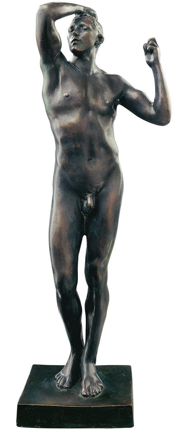 'Das eherne Zeitalter' - der ursprüngliche Titel lautete 'Der Besiegte' - war Rodins erste Bronzeskulptur. Deutlich zu spüren sind die entscheidenden Einflüsse seiner Italienreise, bei der er Werken Michelangelos und Donatellos begegnete. Auf dem Salon von Paris und Brüssel 1877 löste diese Skulptur wegen ihrer ausgeprägten Realitätsnähe einen Skandal aus.Original: Bronze, Musée Rodin, Paris / Metropolitan Museum of Art, New York. Entstanden 1876. Version in edler Bronze, gegossen von Hand nach dem Verfahren der verlorenen Form. Höhe 36 cm.