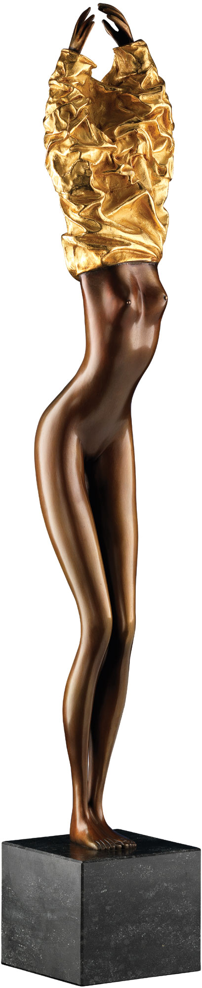 Diese Skulptur Bruno Brunis aus dem Jahr 2013 zeigt einen Frauenakt von graziler Expressivität. Die zarte weibliche Gestalt besticht durch den für Bruni typischen Linienzauber und Sensualismus sowie den einzigartigen Faltenwurf. Eine subtile Komposition zeitloser Ästhetik und künstlerischer Harmonie. Skulptur in feiner Bronze, gegossen im Wachsausschmelzverfahren, teilweise vergoldet. Auf einem Sockel aus Diabas. Limitierte Auflage 236 Exemplare, nummeriert und signiert. Format 12 x 81 x 12 cm (B/H/T). Gewicht 10,3 kg.