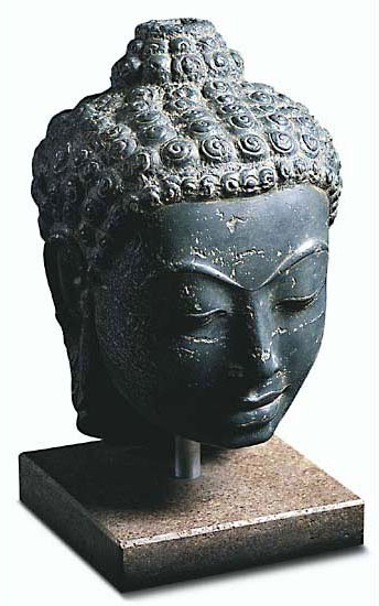 Auf der Suche nach Erleuchtung verbrachte der Fürstensohn aus dem Geschlecht der Shakya sieben Jahre in absoluter Askese. Dieser einzigartige Buddha-Kopf aus Wat Pa Pratat zeigt den Lehrer der vier edlen Wahrheiten in absolutem Seelenfrieden und gehört wohl zu den schönsten Buddha-Abbildungen überhaupt. Das Gesicht lässt den typischen Schnitt der Dvâravatî-Periode erkennen. Original: Staatl. Museum für Völkerkunde, München. Thailand, Wat Pa Pratat, 7.-9- Jh. n. Chr. Polymeres ars mundi Museums-Replikat, von Hand gegossen, Höhe inkl. Sockel 34 cm. Format Sockel 14 x 14 cm. Gewicht ca. 9 kg.