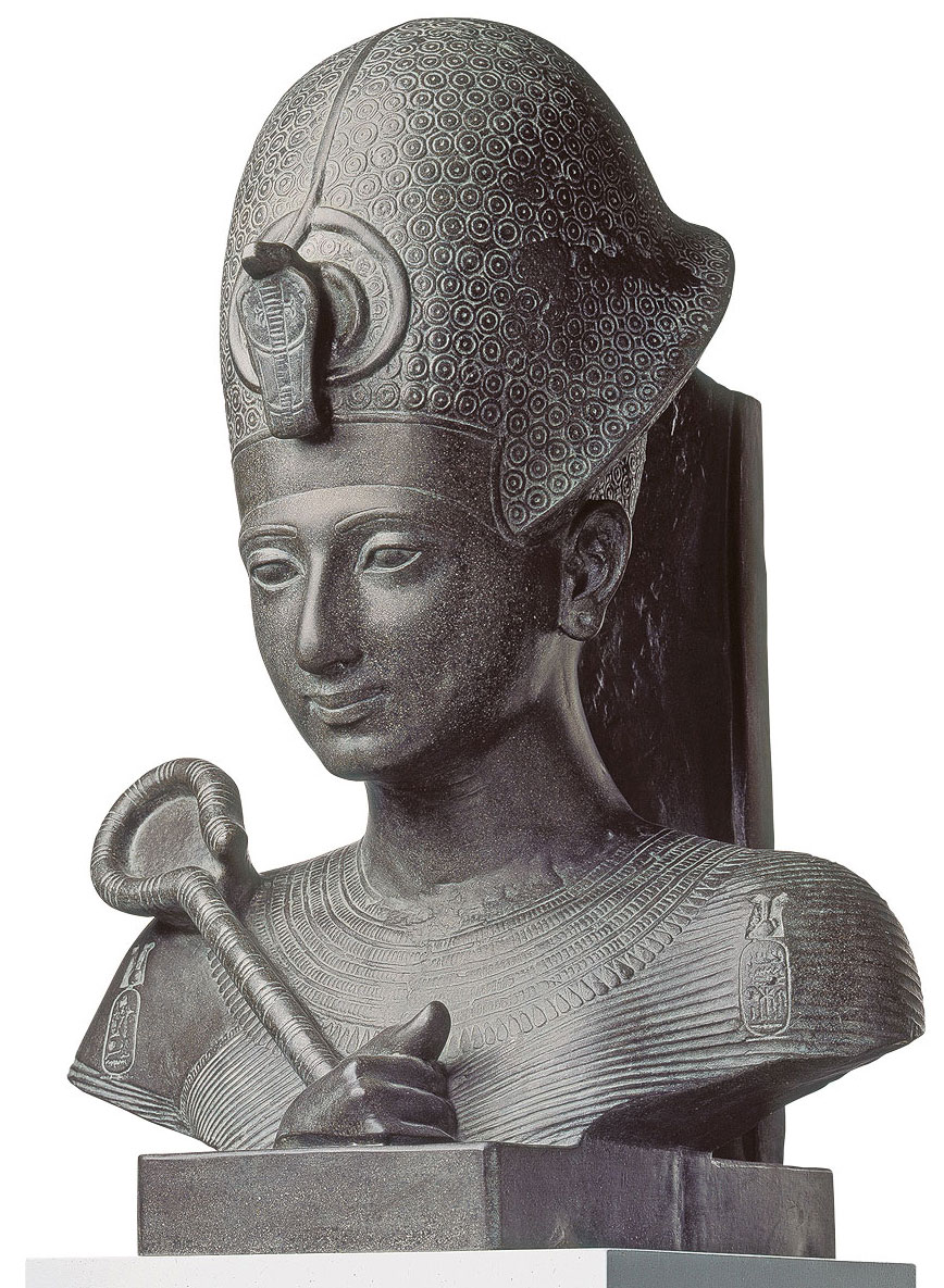 Als fleißigster Bauherr Ägyptens führte er das Weltreich noch einmal zu äußerem Glanz. Traditionsgemäß militant ließ er sich so als idealisierter, ewig jugendlicher Gott und Herrscher in schwarzem Granit darstellen. Die Hand mit dem Krummstab ist zur Faust geballt, die 'Blaue Krone' mit der Uräusschlange an der Stirn zu einer Art Kriegshelm modifiziert. Doch die weichen fast freundlichen Gesichtszüge deuten darauf hin, dass er ein lange regierender Friedenskönig war. Original: Museu Egizio, Turin, Granit. Fundort: Karnak. Ägypten, Neues Reich, 19. Dynastie, um 1250 v. Chr. ars mundi Museums-Replikat in Kunstguss. 78 cm Höhe, Breite 62 cm, Sockel 25 x 44 x 6 cm.
