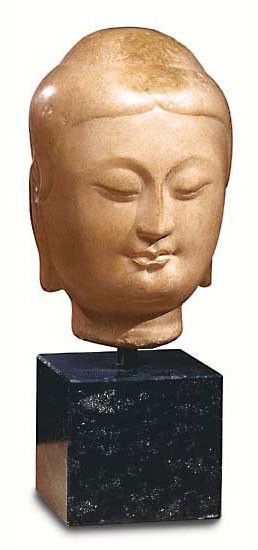 Eine gerade in ihrer Schlichtheit ergreifende Darstellung: Die einst von reichem Geschmeide gelängten Ohren sind schmucklos im Sinne des historischen Buddha, der alle Zierde mitsamt seinem Rang ablegte. Der flächig gestaltete Kopf mit den klaren, reinen Gesichtzügen, der nach Innen gerichtete Blick und das friedvoll lächelnde Antlitz verschmelzen zu einem Ausdruck perfekter Harmonie. Original: Chi Dynastie, 6. Jh. n. Chr., MMA, New York. Reduktion als ars mundi Museums-Replikat, von Hand gegossen in polymerem Kunstmarmor auf schwarzem Diabassockel. Format 12 x 11 x 12 cm (B/H/T). Höhe mit Sockel 38 cm.
