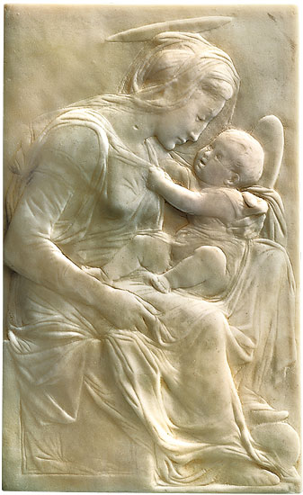 Die innige dem Jesusknaben zugewandte Madonna als junge Patrizierin im Florentiner-Kostüm verkörpert feierlich das weibliche Ideal einer Epoche an der Schwelle der Neuzeit. Original: National Gallery of Art, Washington. Italien, 15. Jh., nach einem Desiderio da Settignano (um 1430-1464) zugeschriebenen Basrelief, Marmor. Polymeres ars mundi Museums-Replikat, von Hand gegossen. Mit Aufhängevorrichtung. Format 27 x 16,5 cm.