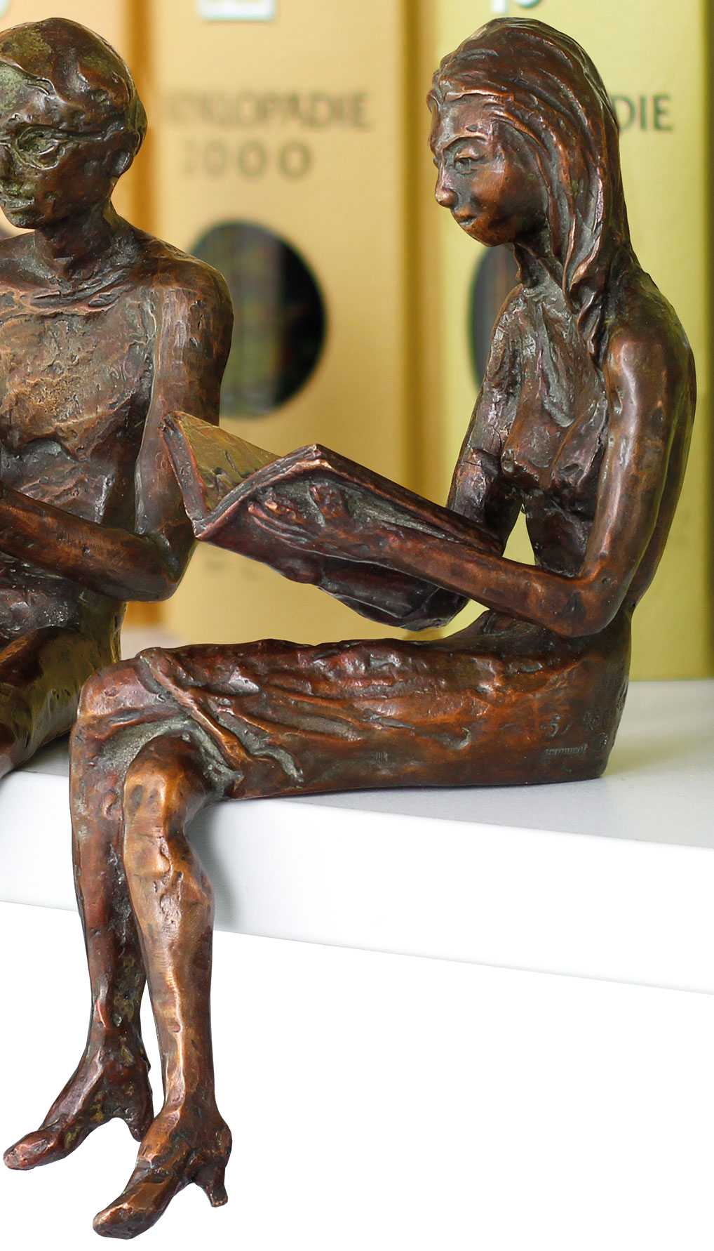 Produktinformation "Birgit Stauch: Skulptur / kantskammel 'Book reader', støbt metal"