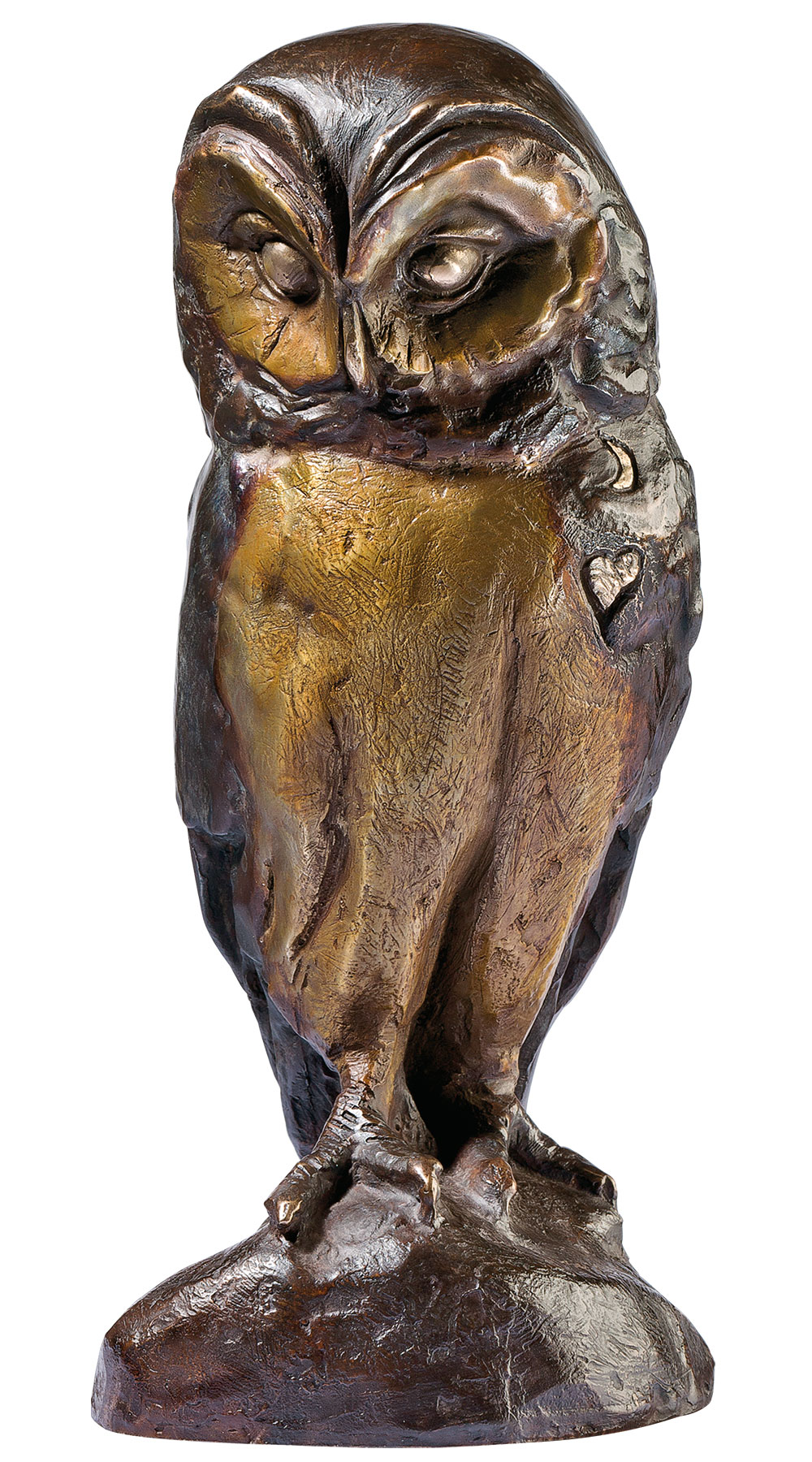 Uglen har symboliseret visdom siden oldtiden. Og derfor har talrige kunstnere som Albrecht Dürer, Hieronymus Bosch, Max Ernst og Pablo Picasso givet form til uglen i deres malerier og skulpturer. Vi finder også denne natlige fugl i Bruno Brunis grafiske arbejde. Og nu har Bruni fortryllet den ind i den tredje dimension. Hans skulptur viser os de karakteristiske træk ved den fjerklædte jæger: den slanke krop, de årvågne øjne i de store fjerhuler og de udstrakte fjer. Den strukturerede overflade giver os indtryk af en håndgribelig materialitet: Det er, som om vi kan mærke fjerene. Patineringen i gyldenbrun bronze med skinnende accenter giver uglen plasticitet og livskraft. Skulptur i bronze, patineret, delvist poleret, støbt ved hjælp af tabt voks-teknik. Begrænset oplag på 240 eksemplarer, nummereret og signeret. Højde 30 cm. Bredde 12 cm. Dybde 14 cm. Vægt ca. 3,8 kg.