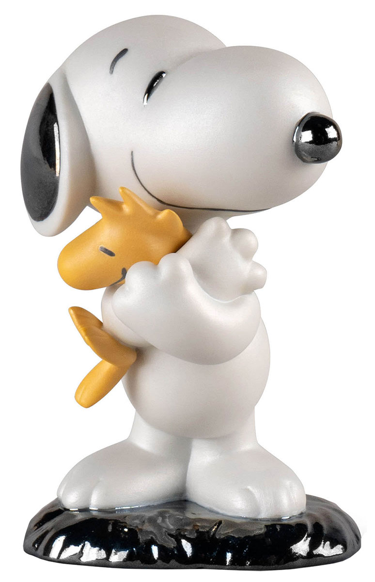 En af de figurer, som Charles M. Schulz skabte til Peanuts-tegneserien, Snoopy, der her krammer sin trofaste ven Woodstock. Den perfekte gave til enhver Peanuts-elsker. Figuren er lavet af mat og glaseret porcelæn, dekoreret med perlemorsfarver. Størrelse 13 x 8 x 10 cm (h/b/d). © 2023 Peanuts Worldwide LLC