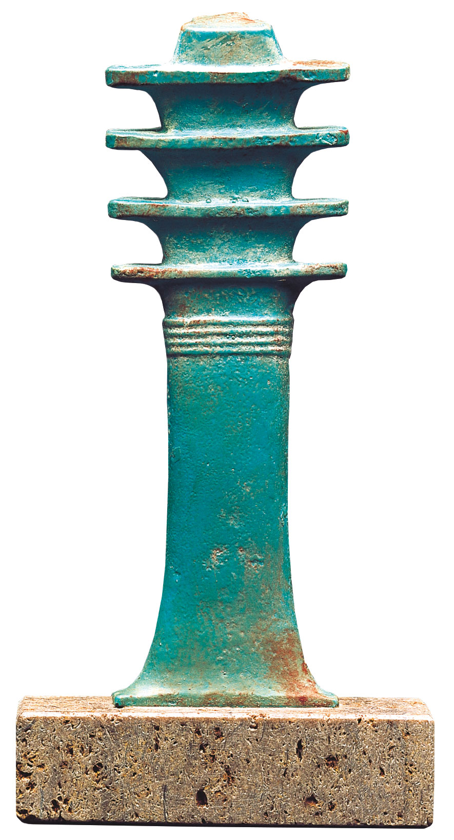 Als Symbol des Totengottes Osiris galt der Djed-Pfeiler, das Schriftzeichen für 'Dauer'. Original: National Museum, Warschau. Ägypten, Spätzeit, 6./5. Jh. v. Chr. Fayence, Höhe mit Sockel 15 cm.
