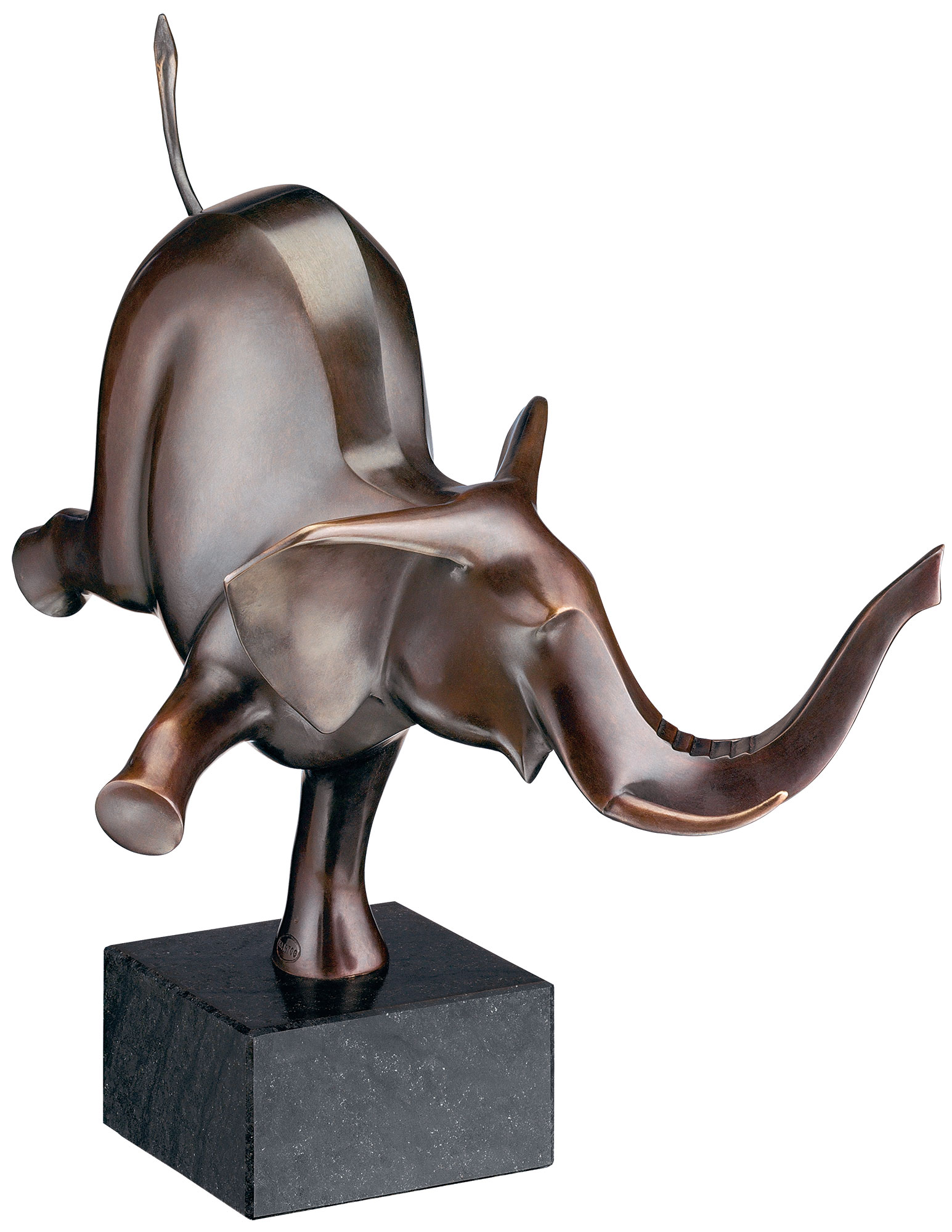 The Dutch sculptor Evert den Hartog has taken up the challenge of combining weightlessness and earthiness. Den Hartog received his artistic training at the Academy of Fine Arts in Rotterdam from 1971 to 1976, initially creating mainly ceramic sculptures until he discovered his passion for bronze in the early 1980s. The themes of his works originate from the animal world and are rooted in ancient mythology in his multi-faceted selection of motifs. There is a tremendous joie de vivre and dynamism in all of Hartog's works. The unmistakable Dutch humour sparkles from the objects and lends the bronze sculptures an unexpected lightness. Evert den Hartog presents his extensive oeuvre to a large audience in Dutch and German galleries. His love-struck elephant dances like a prima ballerina on just one leg and almost seems to lift off the ground with bliss. With its trunk raised, this masterpiece brings its owner additional luck and keeps all worries at bay. Sculpture in fine bronze, cast by hand using the lost wax technique, patinated and polished by hand. Limited world edition of 299 pieces, individually numbered and labelled with the Hartogs signature emblem. On a black diabase base, total height 41 cm. Weight 11 kg. ars mundi exclusive edition.
