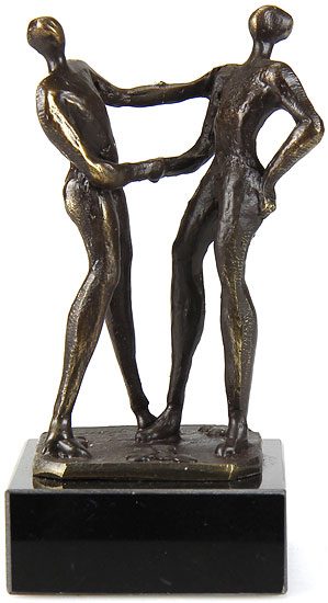 A promise with a handshake, a word that stands. That's how it used to be and how it still is today. Sculpture made of cast metal with a bronzed surface on a black marble base. Size approx. 12 x 5 x 5 cm (H/W/D).