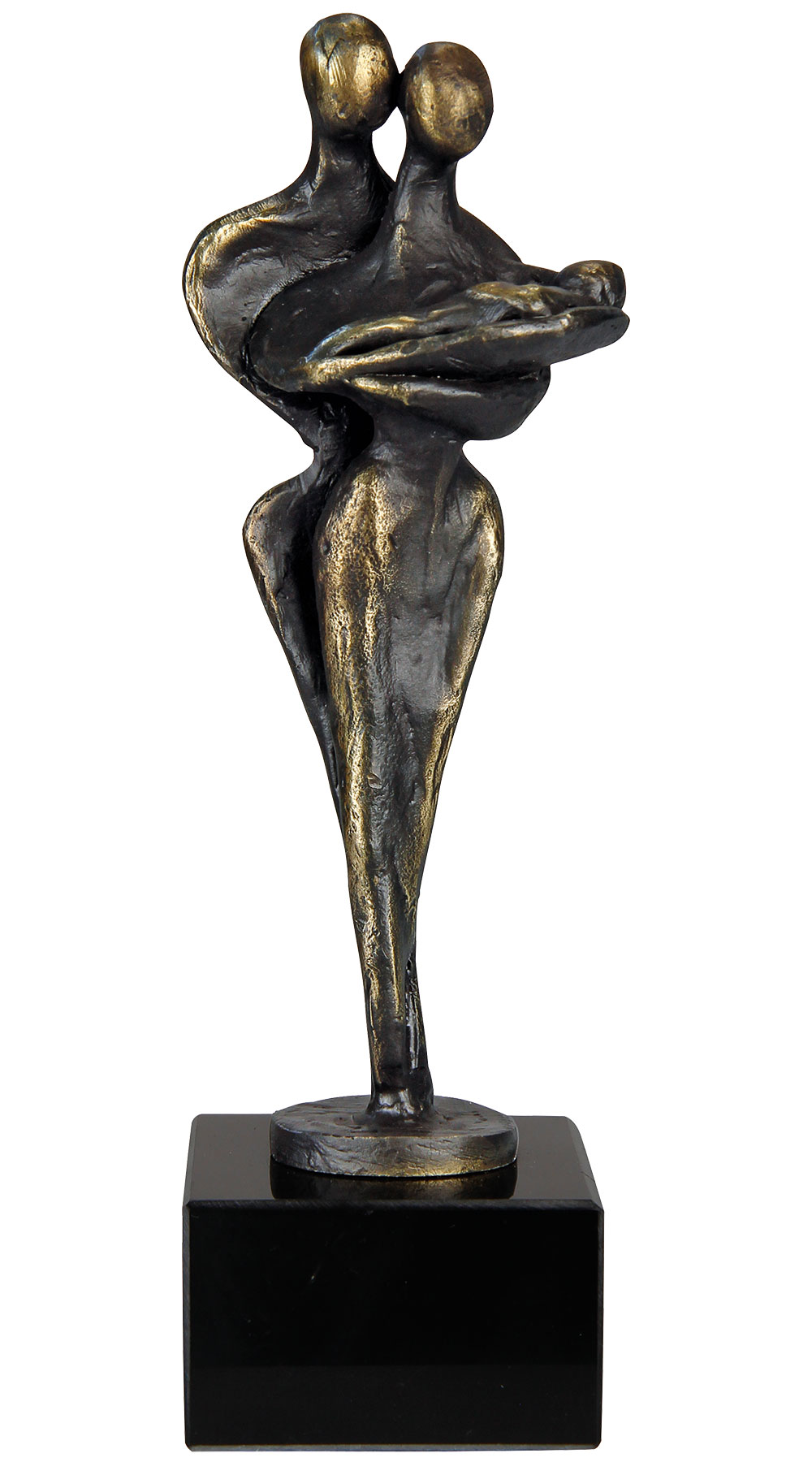 Closely embraced in loving togetherness. An intimate depiction of a family created in reduced forms. Cast metal with bronzed surface on a black marble base. Size 22 x 7.5 x 7.5 cm (h/w/d). Weight approx. 1.2 kg.