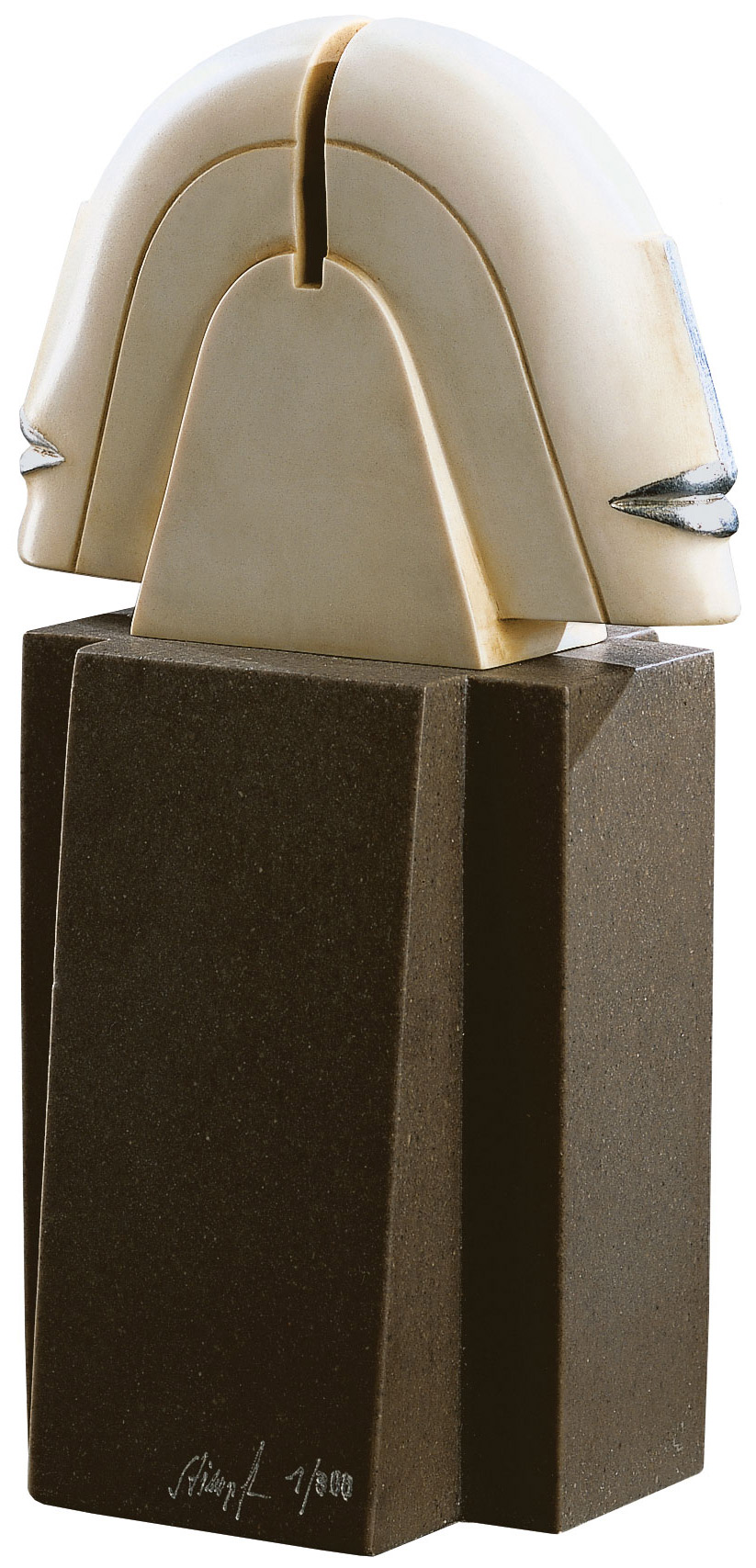 Born in Eben, Austria in 1945, the artist, who has travelled from New York to South America and Asia, restored the large outdoor sculptures at the Belvedere and Schönbrunn palaces in Vienna before becoming a freelance sculptor. Through his exhibitions of sculptures, etchings, pastels and drawings in Hamburg, Frankfurt, Munich, Bologna, Milan, Paris, Geneva and Vienna, he has found many friends of his work throughout Europe. His 'double-headed' sculpture, whose smooth, rounded surface tempts the viewer to touch it, is reminiscent of the Roman god Janus, who was originally regarded as the guardian of the door. This is why he is depicted with a double face, looking inwards and outwards. He became the god of beginnings and endings. The first month of the year, January, is named after him. Total height 29 cm; length 15 cm, width 13 cm. Limited, numbered and signed. Edition in white, polymer-bound artificial marble. Edition of 300 copies.