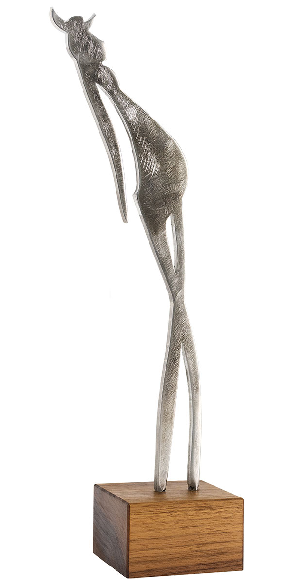 Sculpture made of ground and polished stainless steel on a wooden base. Size 35 x 5 x 5 cm (H/W/D). Weight approx. 0.5 kg.