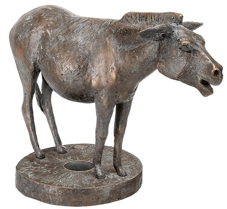 Stubborn and obstinate, the donkey has been a faithful helper to mankind since time immemorial - as the mill wheel on the ground subtly suggests. Edition in bronze, cast using the lost wax technique, chiselled and patinated by hand. Limited to 49 numbered and signed copies. Size 27 x 19 x 35 cm (h/w/d). Weight approx. 8.2 kg.