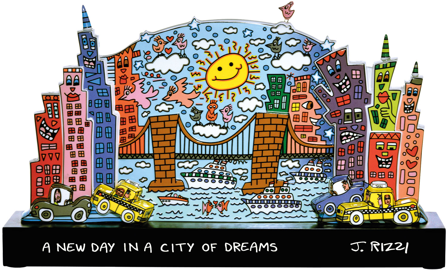 Pop artist James Rizzi shows the city of dreams from its lively side. The sculpture shows New York by day on one side and New York by night on the other. Table sculpture made of fine porcelain on a plinth. Limited to 499 pieces, signed. With certificate. Size incl. base 28.5 x 48 x 11.5 cm (h/w/d).