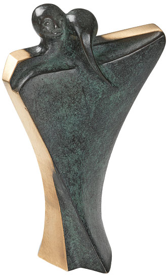 The lively contrast between brightly polished, luminous edges and dark green patinated surfaces not only reflects the flowing dynamics of the dancing couple, but also the contrast and harmony of the relationship between person to person, individual to individual. Devotion, dedication, love - feelings that never lose their significance. Sculpture from the 'Harmony' series by Luise Kött-Gärtner. Bronze, height 14 cm.