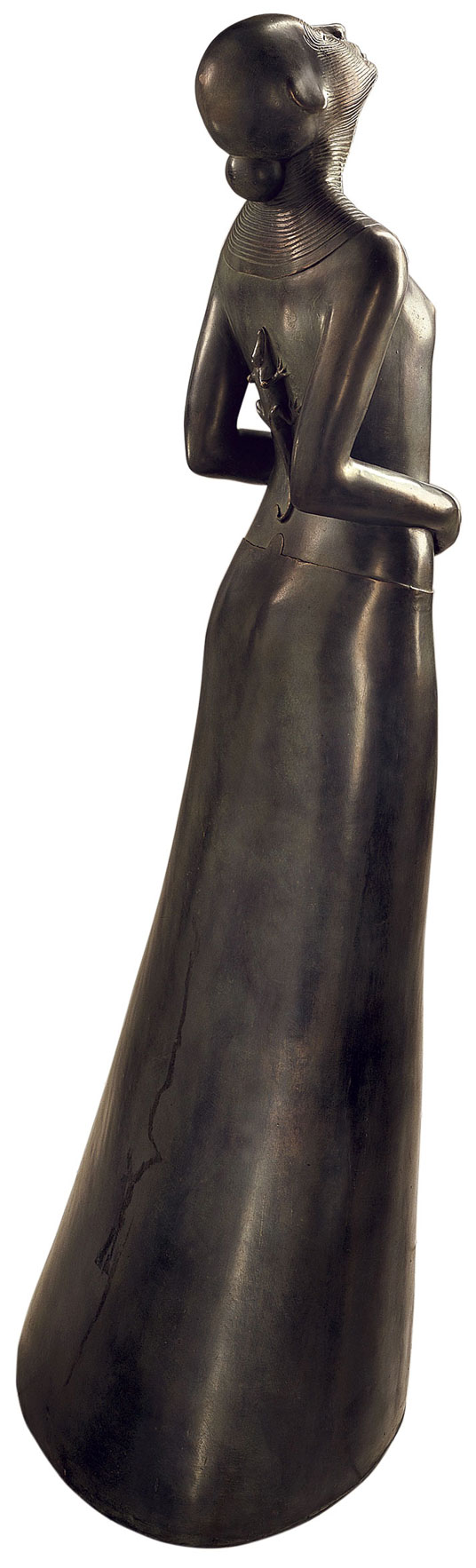 His statues, wall reliefs and fountains, groups of figures, material paintings and exhibitions in Germany and abroad have made the Baden painter and sculptor Rainer Stiefvater widely known, and this work, which was only published in a small collector's edition and solemnly praises the beauty of creation, could soon be out of print. The artist, who was fond of mystery cults, was inspired to create his archaic frontal figure by sculptures from Freiburg Cathedral, but went back to their natural-cult source, the Magna Mater, once celebrated as the Mistress of the Earth with orgiastic spring festivals. This cycle is also symbolised by the growth rings rising from her shoulders. On her back she carries a lizard, which has symbolised the dark forces since the High Middle Ages. Edition of 49 pieces. Height 165 cm.