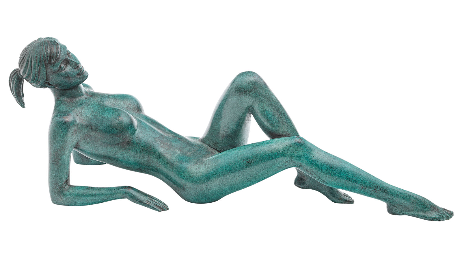 A female nude in its most beautiful form: Richard Senoner's 'Reclining Woman'. When designing his sculptures, Richard Senoner closely orientates himself on the real forms of the human physique and attaches great importance to very detailed and precise workmanship. This perfect moulding in combination with the light green patina of the polished bronze determines the impressive and highly aesthetic character of Senoner's work. Sculpture in bronze, cast using the lost wax technique, polished by hand and patinated in green. Moulded directly from the original. Limited edition of 49 pieces, numbered, signed and hallmarked with the foundry stamp. With numbered certificate of authenticity and limitation certificate. Size 17 x 47.5 x 12 cm (h/w/d). Weight approx. 4.3 kg. ars mundi exclusive edition.