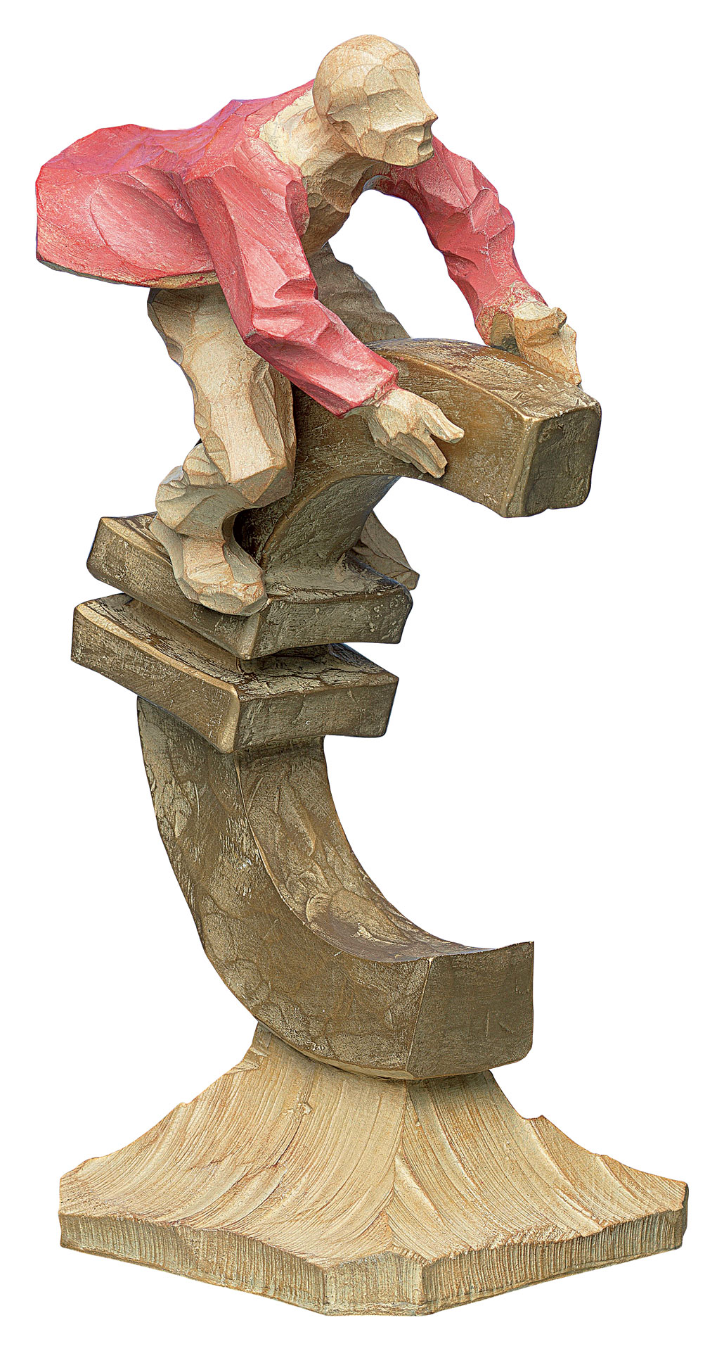 Sculptor Roman Johann Strobl uses a chainsaw to carve delicate and expressive sculptures out of massive tree trunks. His feel for the material and his virtuoso handling of his tools even enable him to create astonishingly precise portraits - as he did at Expo 2000, for example, when he carved the likeness of Gerhard Schröder out of a tree trunk in front of a stunned audience. Strobl's professional portrait shows him from his cheerful side: the banker riding the euro humorously demonstrates what the representative of this profession is made of. Replica of a filigree wooden sculpture. Polymer moulding with wood finish, partly hand-painted, size 12.5 x 29 x 11.5 cm (W/H/D).