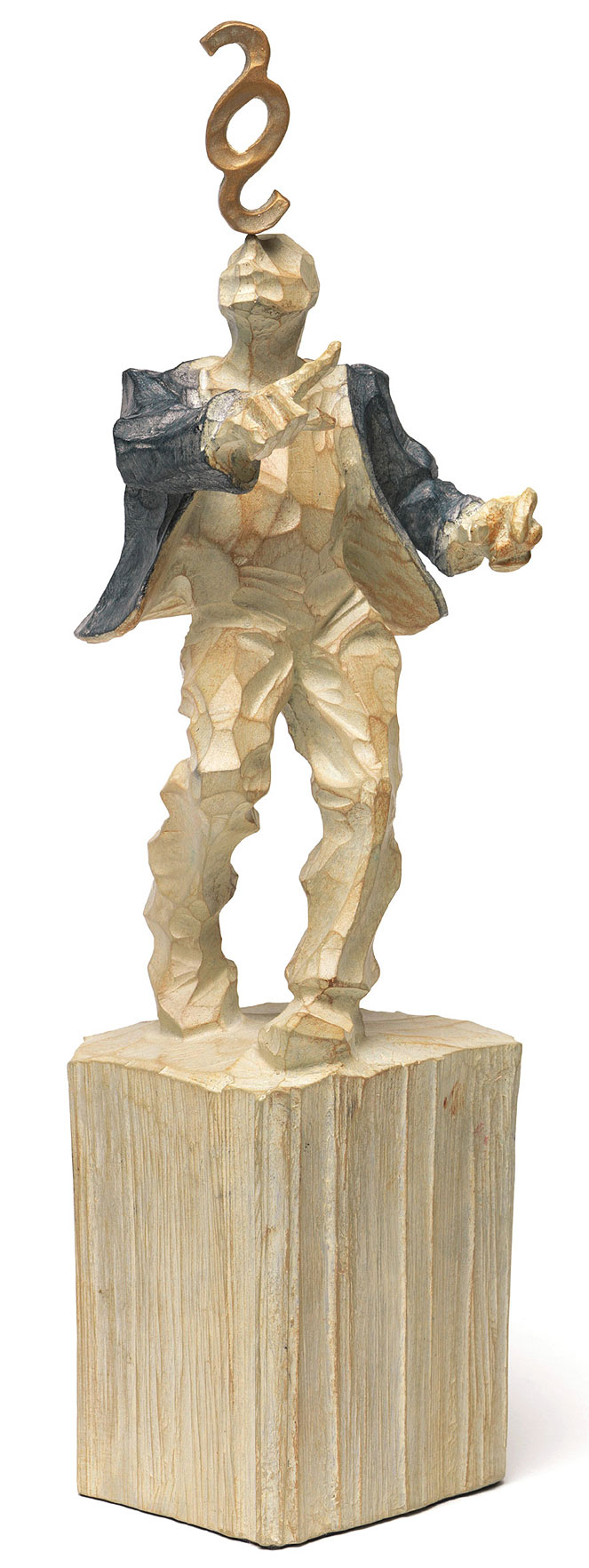 Sculptor Roman Johann Strobl uses a chainsaw to carve delicate and expressive sculptures out of massive tree trunks. His feel for the material and his virtuoso handling of his tools even enable him to create astonishingly precise portraits - as he did at Expo 2000, for example, when he carved Gerhard Schröder's likeness out of a tree trunk in front of a stunned audience. Strobl's professional portrait shows him from his cheerful side: the lawyer juggling the paragraphs shows in a humorous way what the representative of this profession is made of. Replica of a filigree wooden sculpture. Polymer moulding with wood finish, partly hand-painted, size 9.5 x 33 x 8 cm (W/H/D).