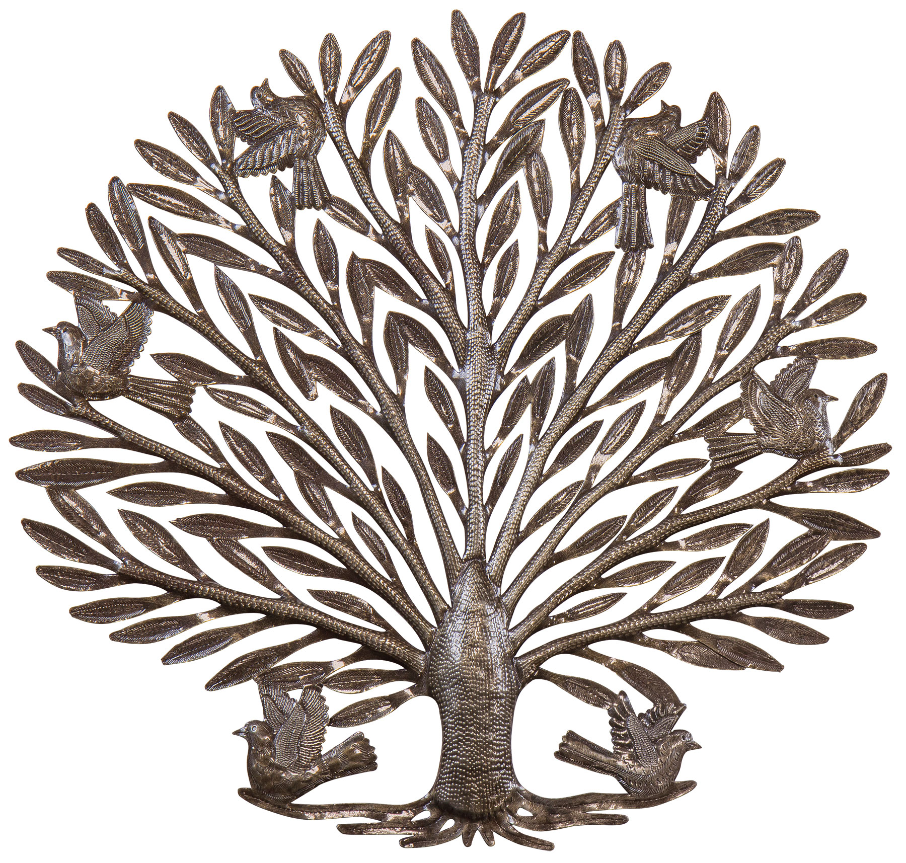 Bosmetal art has been a Haitian tradition since the 1950s. The iron tree with its lush foliage and birds cavorting in the branches is a particularly beautiful, almost meditative wall object. Diameter approx. 60 cm. Weight 1.2 kg.