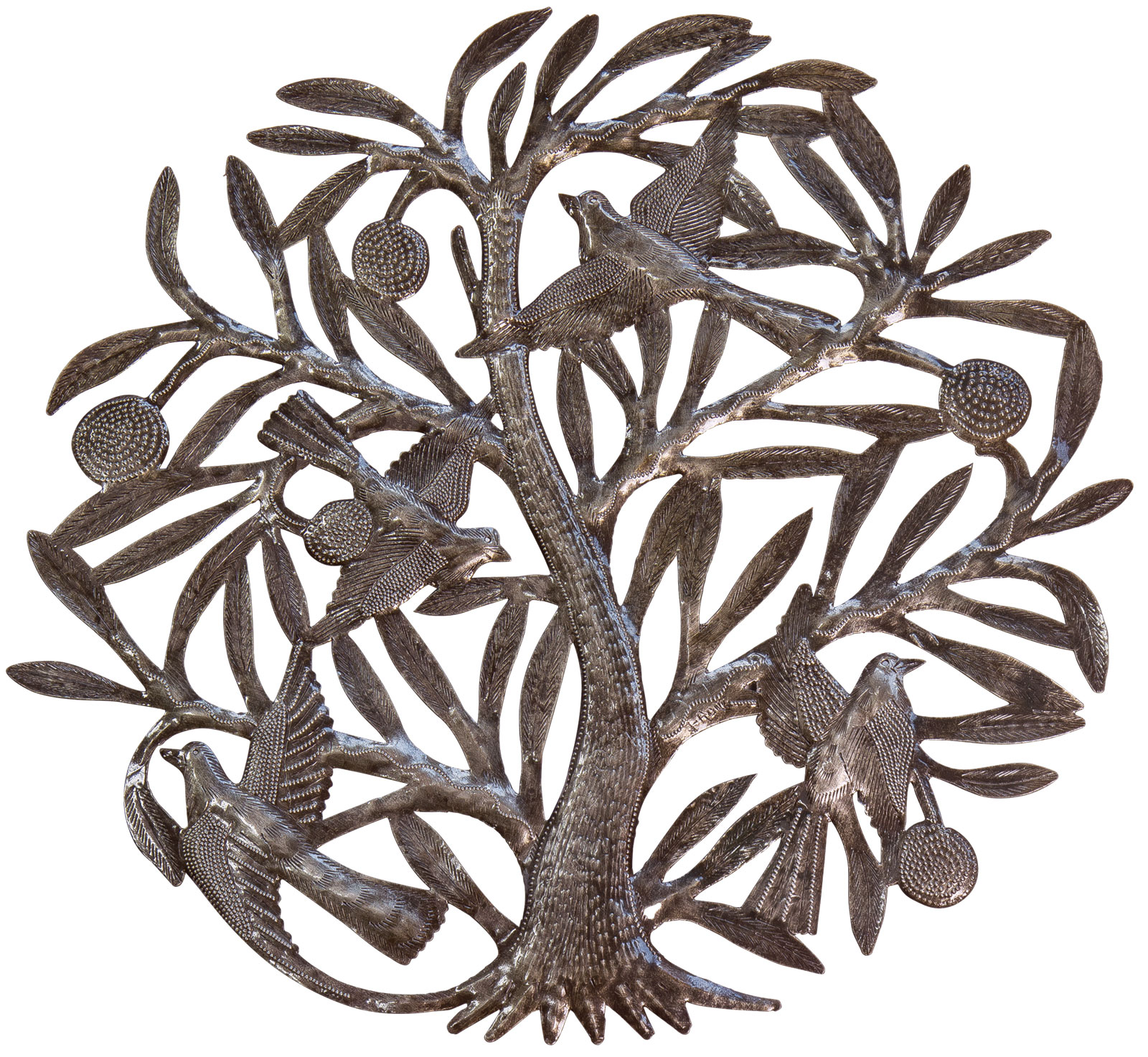 Bosmetal art has been a Haitian tradition since the 1950s. A particularly beautiful - almost meditative - wall object is the iron tree with its lush foliage, fruit and birds cavorting in the branches. Diameter approx. 60 cm. Weight approx. 1 kg.