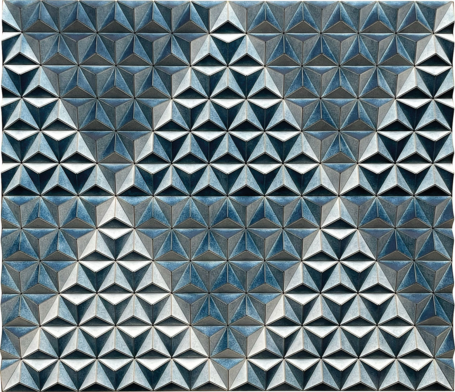 'Wall topographies' - this is what Berlin artist Sebastian Welzel calls his unique works. He creates large surfaces with a relief-like structure from many tetrahedrons of the same size. He colours the tetrahedrons, which are around 3 centimetres high, in carefully selected colour combinations. The result is a colourful, three-dimensional surface whose visual impression changes depending on the viewing angle and spatial surroundings: On the one hand, the brightness and incidence of light define the shadows and reflections, and on the other, they determine the intensity and tint of the colour. The Prussian blue monochrome colour scheme and the simple rotation of some of the tetrahedrons make this design particularly impressive. Hand-sprayed laminated cardboard with high light resistance on a thin wooden carrier board. Limited edition of 20 copies, numbered and signed by hand. Format 84 x 98 x 3 cm (H/W/D). Weight approx. 3 kg. With hanging device.