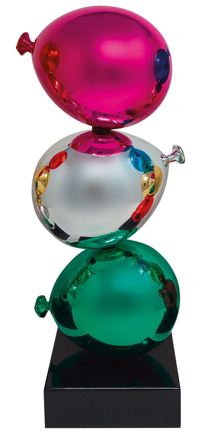 Long live lightness!'Zen Balloons' shows three colourful, metallic balloons, delicately stacked and inviting you to live life lightly and harmoniously. This work of art inspires us to find balance and joy in the colourful shades of life and to create an atmosphere of serenity and lightness in every moment.sculpture made of resin and wood. Enamelled. Numbered edition, stamped by the artist. With certificate. Size 30 x 11 x 13 cm (H/W/D). Weight 3.8 kg. Version in the colours purple-silver-green.