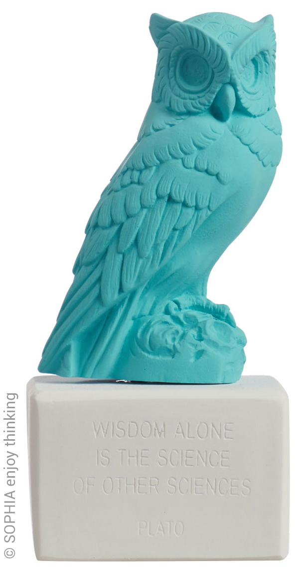Companion animal of Athena - goddess of reason - and worshipped in ancient times as the personification of wisdom, today the owl is regarded as the protector of houses. Quoting: 'Wisdom alone is the science of other sciences' (Plato). As this object was made by hand, slight variations are a sign of quality. Made of ceramine (ceramic-like material). Format 20 x 9 x 7 (H/W/D). © SOPHIA enjoy thinking.