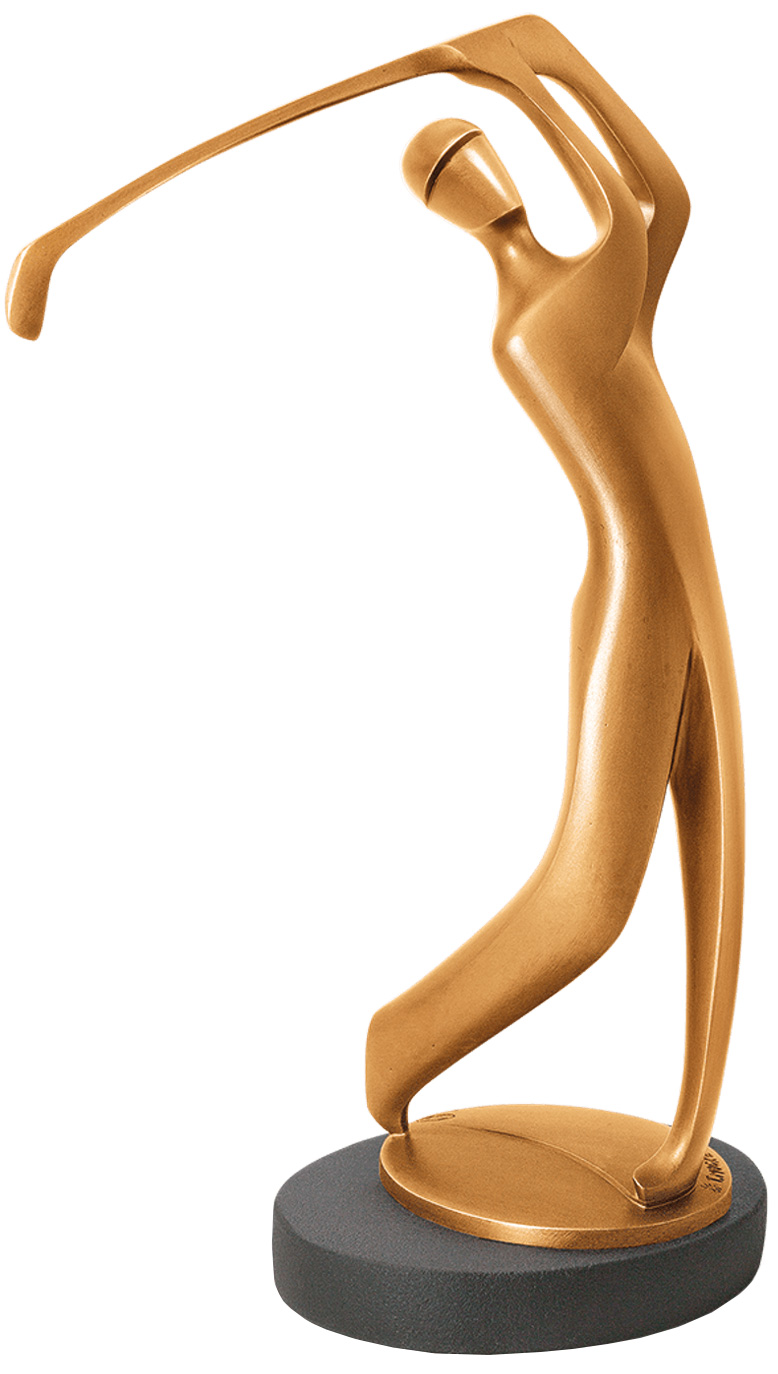 The moment after the tee shot - captured in gleaming gold bronze. Torsten Mücke's 'Golfer' remains in a textbook posture and gazes after the flying golf ball. In this sculpture, the German sculptor expresses the body tension and concentration of the golfer with just a few, but precisely chosen contours. Mücke always pushes the boundaries of abstraction in his modelling, but the figure and its message always remain recognisable. Its essence becomes even more powerful and it becomes a universal symbol with many possible interpretations. Sculpture in fine bronze, chiselled and patinated. Cast by hand using the lost wax technique. On a black granite plinth. Limited edition of 199 pieces, numbered and signed. Format incl. plinth 32 x 20 x 12 cm (h/w/d). Format base 2 x 16 x 12 cm (h/w/d). Weight approx. 3.6 kg.