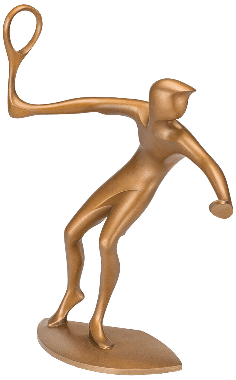 Tennis is a dynamic game. It is fast and requires maximum concentration from both players with every rally. This is especially true when the player has to calculate and prepare his return to an opponent's shot in a matter of seconds. Mücke shows this moment; a blink of an eye later, the player knows how to react. Edition in bronze, cast using the lost wax technique, chiselled and patinated by hand. Limited to 49 numbered and signed copies. Size 33 x 25 x 11 cm (H/W/D). Weight approx. 3.4 kg.