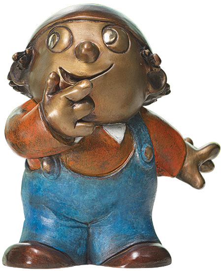 World premiere: Mainzelmännchen - exclusive edition at ars mundi for the 50th stage anniversary in 2013The true television stars wear neither dinner jackets nor evening dresses - they wear pointed caps. And they can look back on a career spanning almost 50 years. Reason enough to erect a small monument to the Mainzelmännchen - in precious bronze and cast stone. The Mainzelmännchen are cult. They have been part of our everyday lives since 2 April 1963 and many of us have taken Anton, Berti, Conni, Det, Edi and Fritzchen to our hearts as children. After almost 50 years of television careers with over 40,000 of their short adverts, the 3 Mainzelmännchen are now available for the first time in bronze and cast stone - sculpted by their spiritual father, the graphic artist and set designer Wolf Gerlach himself, and released by him and ZDF in a strictly limited edition exclusively for ars mundi. Just as the little TV stars were created picture by picture with pencil drawings, their sculptural realisation was also to be of the highest level of craftsmanship. The art foundry we chose guarantees the utmost care in casting and post-processing, such as sanding and chiselling the raw casting by hand through to patination. The multi-coloured patination is a particular challenge. Because just as each of the Mainzelmännchen has its own name and character, it can also be recognised by its clothing. To dress Anton in a red shirt and blue trousers, for example, an extraordinarily complex patination process is required, in which the colours have to be applied in a precisely coordinated sequence and at different temperatures. This requires many years of manual experience and the patineur's dexterity. The results are small works of art, as befits the Mainzelmännchen. And Wolf Gerlach's signature confirms that they are in no way inferior to their famous drawn role models in artistic terms - each one bears his signature. Mainzelmännchen 'Anton', edition in cast bronze: The limited edition of 499 pieces in multi-coloured patinated bronze is cast with great craftsmanship using the traditional lost wax process. Each piece is created exclusively for ars mundi, bears Gerlach's signature and is individually numbered. With hand-numbered certificate. Format approx. 13 x 15 x 11 cm (W/H/D). Weight approx. 2.3 kg.