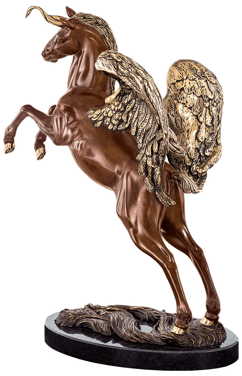 Ernst Fuchs verschmilzt zwei Fabelwesen von Pferdegestalt: das Einhorn und das Flügelross Pegasus. Gerade in der Heraldik wird das Einhorn zumeist aufrecht 'springend' dargestellt. Fuchs erhebt es nun als Pegasus vollends in die Lüfte. Der Himmelsstürmer Pegasus gilt auch als Quelle der Inspiration, da er durch einen Hufschlag auf dem Berg die Musenquelle Hippukrene, den sog. Rossquell, entspringen lässt. Tatsächlich sind sowohl der Pegasus als auch das Einhorn am Himmel bereits als Sternbilder angekommen, wobei der Pegasus an das Sternbild des Schwans grenzt: Betrachtet man das Horn auf der Stirn von Ernst Fuchs' Skulptur, so bemerkt man, dass es nicht gerade, sondern wie ein Schwanenhals geschwungen ist. 'Der ständige Begleiter meiner Künste, das Einhorn, ist auch der Urheber aller Wandlungen. Das Einhorn ist das heraldische Zeichen meiner Bemühungen das Gesamtkunstwerk zu erschaffen. Nun hat es sich zum Pegasus erhoben. Die beiden Mythen aber haben sich in meinem Schaffen vereinigt, selbst das Horn ist in seiner Ähnlichkeit mit dem Lohengrin'schen Schwan zum Zeichen seiner Ankunft vom Grale her erkennbar geworden. Mein Einhorn Pegasus ist das Symbol einer neuen Dimension meiner Künste und deren Zusammenfassung im Gesamtkunstwerk. Den Freunden meiner Kunst und ganz besonders Ihnen - herzlichst gewidmet.' (Ernst Fuchs) Edition in Bronze, gegossen im Wachsausschmelzverfahren, von Hand ziseliert und patiniert. Limitiert auf 300 nummerierte und signierte Exemplare. Format 39 x 19 x 29 cm (H/B/T). Gewicht 9,38 kg.