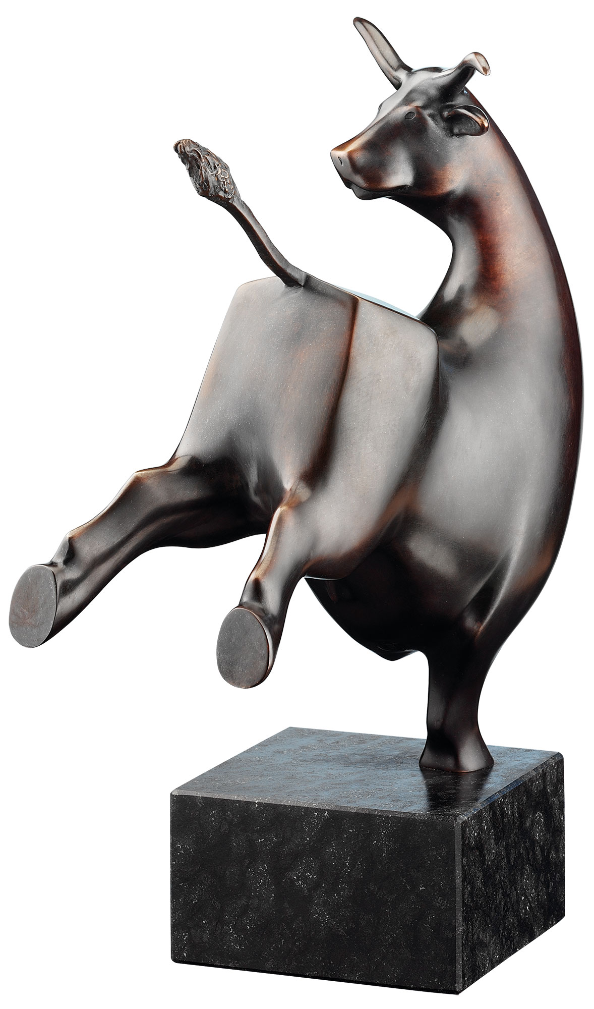 Der tanzende Stier balanciert scheinbar mühelos auf dem Diabas-Sockel und streckt dabei keck drei Beine in die Höhe. Zufrieden schaut er in lächelnde Gesichter - ein besonders schönes Sinnbild für alle, die z.B. auf dem Börsenparkett Erfolge feiern konnten... Skulptur in feiner Bronze, von Hand gegossen im Wachsausschmelzverfahren. Von Hand patiniert und poliert. Limitierte Weltauflage 299 Exemplare, signiert und einzeln nummeriert. Format inkl. Diabas-Sockel 39 x 34 x 16 cm (H/B/T). Gewicht 9,5 kg.