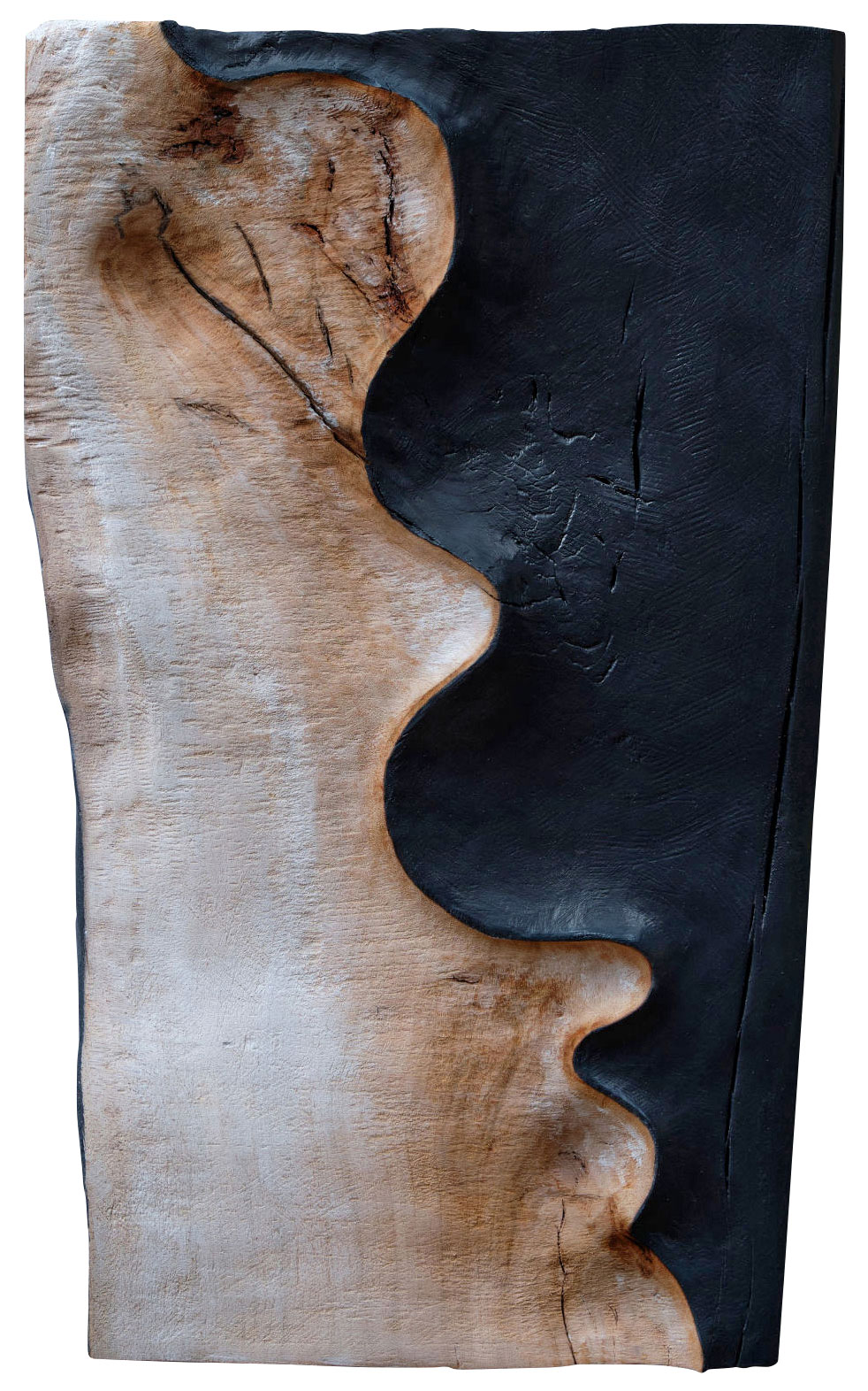 Skulptur aus Lindenholz, mit Acrylfarbe akzentuiert. Mit seitlichem Brennstempel des Künstlers sowie gestanzter Werk-Nummer. Rückseitige Aufhängevorrichtung. Format 50 x 30 x 4 cm (H/B/T). Gewicht ca. 3 kg.