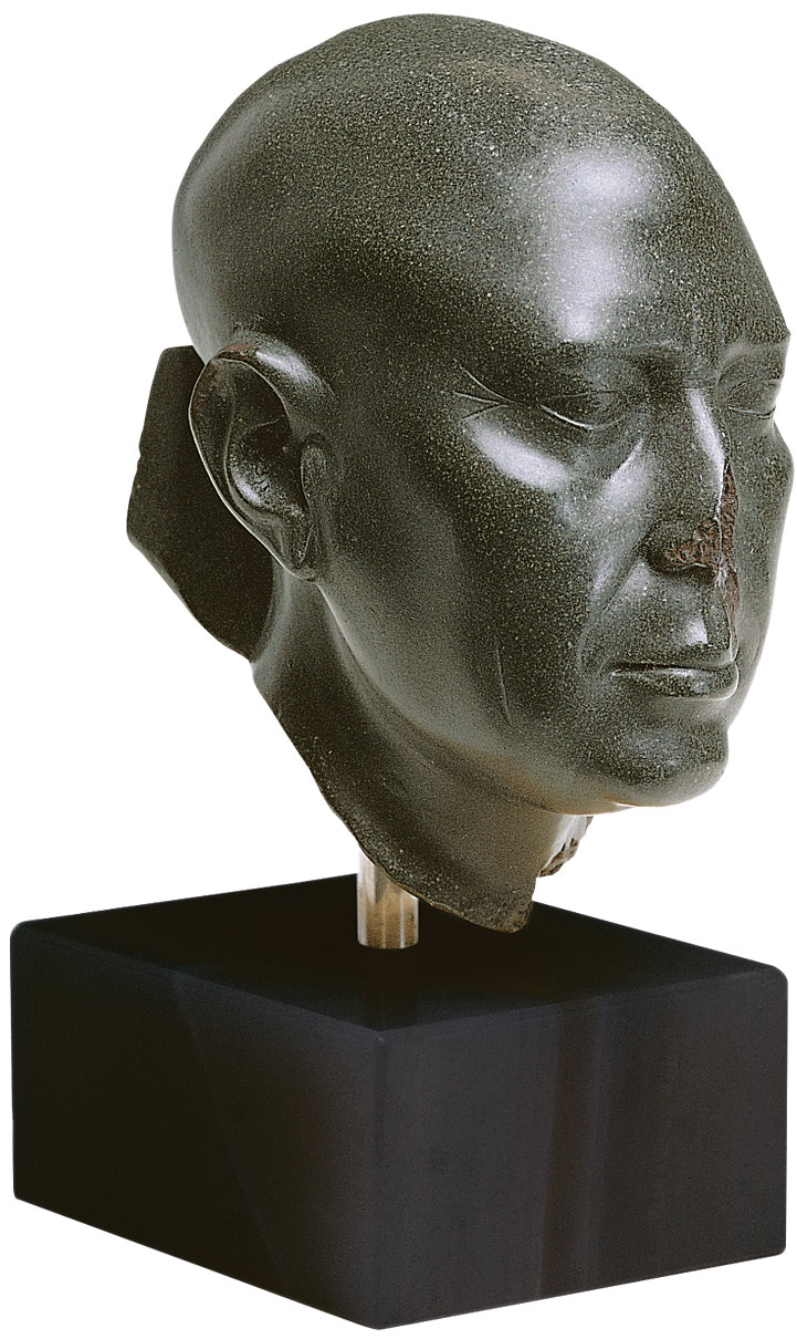 La Tête verte, qui doit son nom à la couleur du matériau utilisé, fait partie des plus grandes réalisations de la sculpture ronde égyptienne de tous les temps. La familiarité de l'artiste avec la structure anatomique de la formation du visage humain, qui s'exprime clairement, est tout aussi unique que la sûreté de sa représentation et de sa transposition dans le langage formel artistique. Malgré cela, il ne faut pas voir dans la Tête verte le portrait réaliste d'un fonctionnaire ou d'un prêtre resté anonyme, mais une tentative réussie de transmettre la profondeur spirituelle et la transcendance de l'être humain. Original : Staatliche Museen zu Berlin - Preußischer Kulturbesitz. Egypte, période tardive, vers 300 av. J.-C., pierre. Réplique polymère de musée ars mundi moulée à la main, hauteur avec socle en diabase 31 cm.