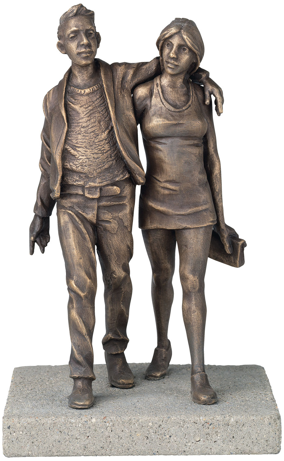 La devise du sculpteur Leo Wirth est 'tout est dans le détail', et chacune de ses œuvres montre à quel point il prend cela au sérieux. Cela vaut également pour ses représentations de personnes du quotidien, auxquelles il s'intéresse particulièrement ; des personnes que chacun d'entre nous pourrait rencontrer dans la rue. 'Modern Life' le montre par excellence : le jeune couple semble en tous points quotidien et résolument contemporain, tout en étant travaillé dans le détail, bien au-delà des vêtements, des accessoires, de la structure des tissus et des drapés. Car lorsque Wirth parle des détails qui comptent, il ne pense pas seulement à l'exécution artisanale, mais surtout à la mise en œuvre des plus petits gestes observés avec précision, qu'il saisit et rend visibles dans l'œuvre d'art : c'est la démarche désinvolte du jeune homme, son bras posé comme par hasard sur l'épaule de sa compagne et son regard qui parcourt le monde avec assurance qui rendent 'Modern Life' vraiment vivant. Il s'agit manifestement d'un couple 'd'égal à égal' qui, que ce soit par amitié ou par amour, a le sentiment d'appartenir à la même famille et qui avance dans la vie avec une grande affection l'un pour l'autre. Sculpture en bronze, coulée à la cire perdue, ciselée à la main, polie et patinée. Sur socle en béton. Edition limitée à 99 exemplaires, numérotés, signés et poinçonnés avec le cachet de la fonderie. Avec certificat d'authenticité et de limitation numéroté. Format, socle inclus, env. 24 x 14,5 x 13,5 cm (h/l/p). Poids env. 3,1 kg. Édition exclusive ars mundi.