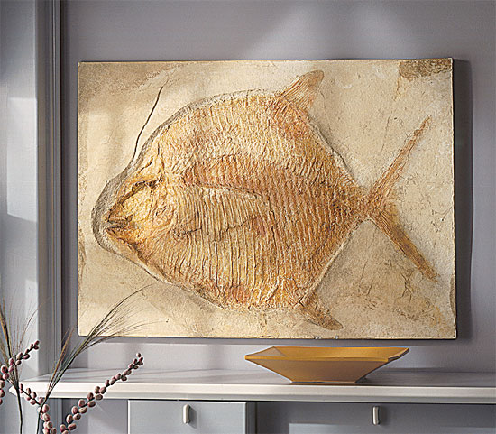 Ces anciens dominateurs de la mer jurassique n'ont survécu que sous des formes de retraite. Les pycnodonides à écailles rhombiques en forme de disque possédaient une dentition de broyage riche en dents. Original : Musée Bürgermeister-Müller de Solnhofen. Jurassique blanc / Malm. Réplique polymère du musée ars mundi, moulée à la main, avec effet calcaire. Format 102 x 73 cm (l/h) avec dispositif d'accrochage.