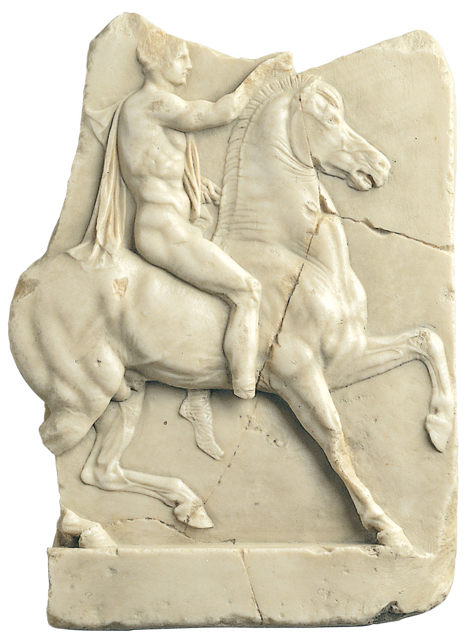 Le cheval et le cavalier étaient des motifs particulièrement appréciés dans la Grèce classique. La représentation détaillée avec l'individualité incomparable du profil est déjà clairement hellénistique. Trouvé à Rhodes, 100 ans avant J.-C., en marbre. L'original est aujourd'hui accroché au MMA, New York. Réplique polymère du musée ars mundi, coulée à la main. Format env. 33 x 47 cm. Avec dispositif de suspension. Poids 7 kg.