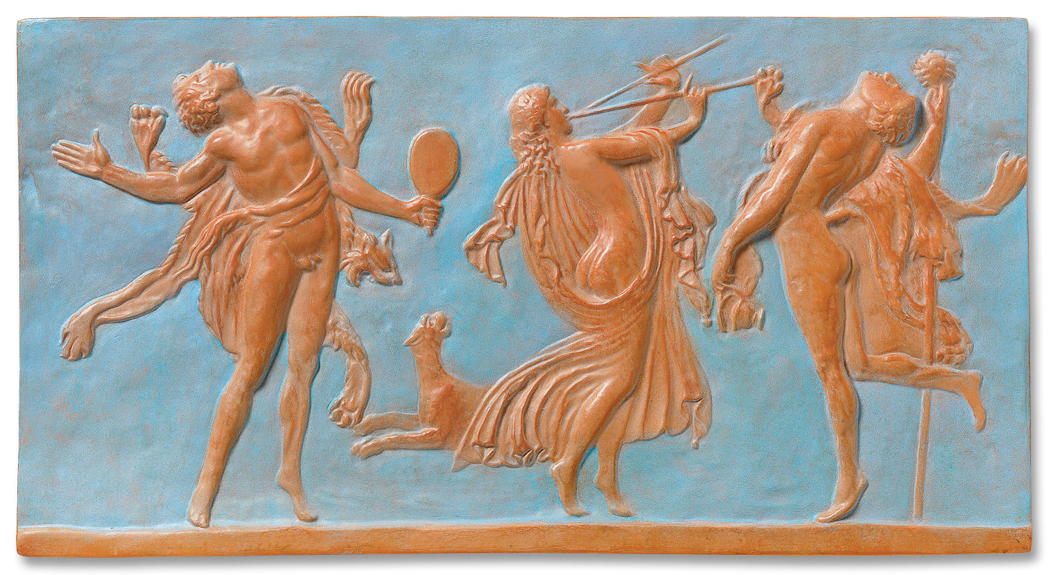 Même les menaces de punition les plus sévères du Sénat n'ont pas pu empêcher les élégants patriciens romains de se costumer de manière frivole et mythologique au son de la double flûte et de donner libre cours à leurs rites favorisant le dieu du vin Bacchus. Original : Musée du Louvre Paris. Romain, 2e-1er s. av. J.-C., pierre. Réplique polymère de musée ars mundi moulée à la main, format avec dispositif de suspension 61 x 32 cm.