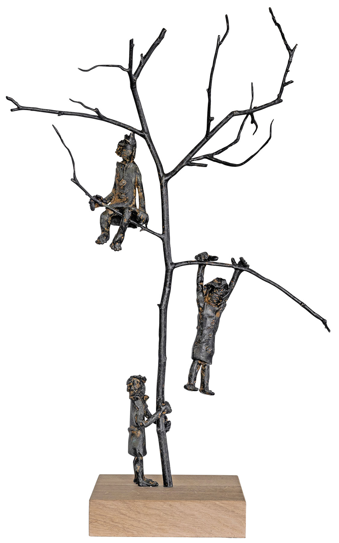 Der Belgier Freddy De Waele beschäftigt sich schon lange mit der figurativen Gestaltung. Seine expressiven Skulpturen haben oft etwas Kindliches, Leichtes und Verspieltes. In seinem 'Tree of Joy' zeigt er fröhliche Kinder, die an einem Baum klettern und verweist damit auf die Freude an den einfachen Dingen. Skulptur in feiner Bronze, patiniert und poliert mit Eichenholzsockel. Von Hand gegossen im Wachsausschmelzverfahren. Limitierte Auflage 75 Exemplare, nummeriert und signiert, mit Zertifikat. Format 65,5 x 38 x 18 cm (H/B/T). Gewicht 3 kg.