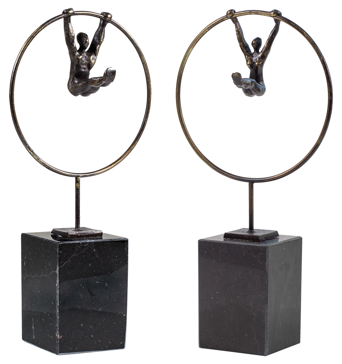 Kraftvoll, elegant und voller Selbstvertrauen halten die beiden Protagonisten die Balance, genau mittig des Kreises. Ein Bild vollkommener Harmonie und Körperbeherrschung. Metallguss, bronziert. Auf Marmorsockel.Balance Masculine: Format 21 x 9,5 x 6 cm (H/B/T). Gewicht ca. 0,5 kg. Balance Feminine: Format 21 x 9,5 x 6 cm (H/B/T). Gewicht ca. 0,5 kg. Beide Skulpturen im Set.