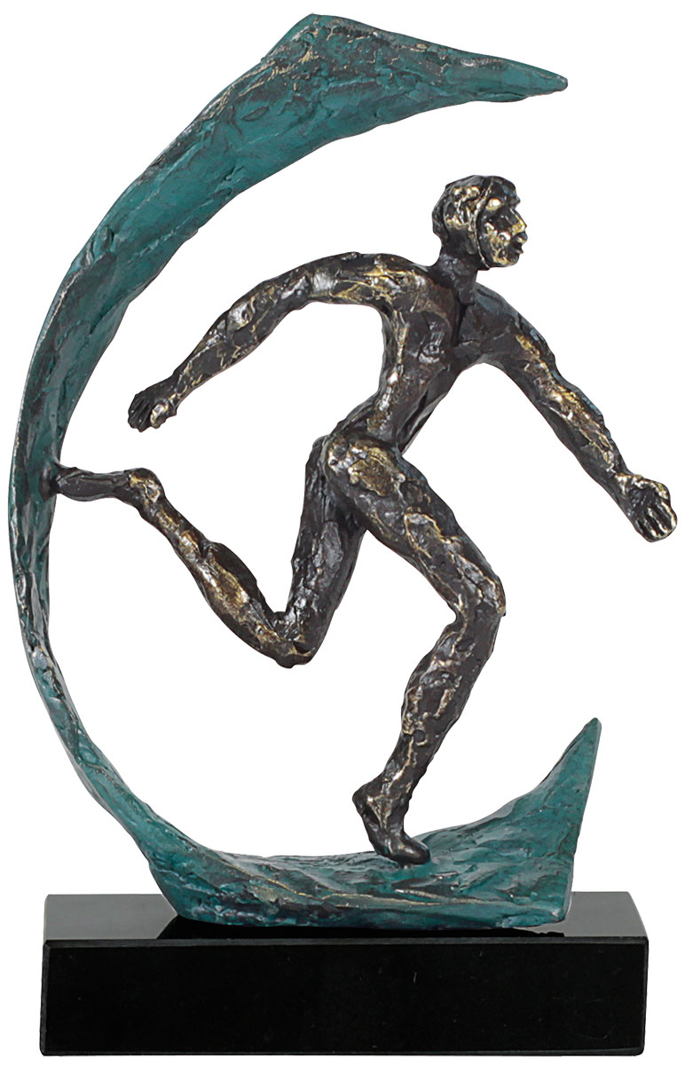 In einer dynamischen Halbkreisform versinnbildlicht der Läufer eine wichtige Eigenschaft für die Erreichung von Zielen. Bronzierter Metallguss, Marmorsockel. Format 17,5 x 11 x 4 cm (H/B/T).