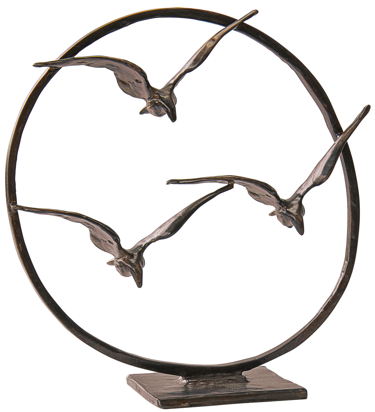 Frei wie die Vögel. Anmutig ziehen drei Vögel in den Sonnenuntergang. Metallguss mit bronzierter Oberfläche. Format 24 x 24 x 9,5 cm (H/B/T). Gewicht ca. 1,4 kg.