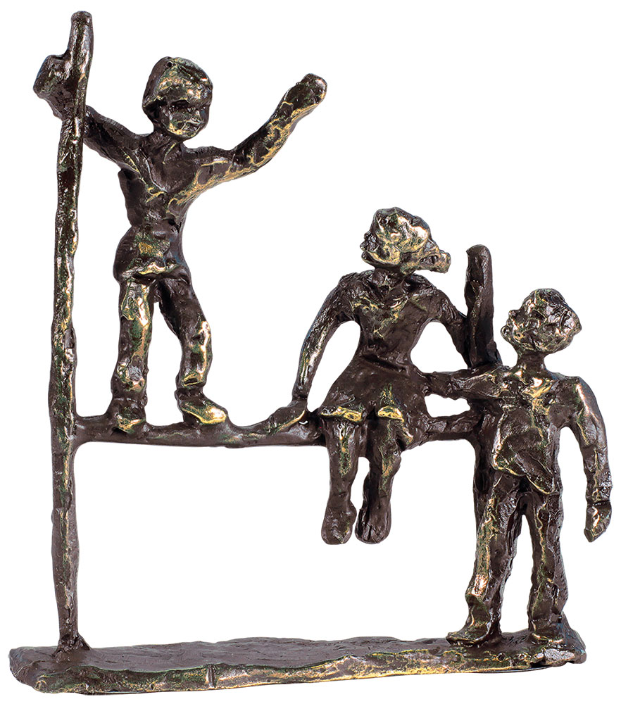Die Skulpturen des Künstlers Gerard erschaffen trotz stark reduzierter Formen ausdrucksstarke Szenen, die Gefühle wecken. Mit diesem fröhlichen Trio setzt Gerard anschaulich um, was der Dichter Christian Friedrich Hebbel so treffend mit Worten beschreibt: 'Spielende Kinder sind lebendig gewordene Freuden'. Hochwertiger Metallguss mit bronzierter Oberfläche. Format 12 x 11,5 x 3 cm (H/B/T).