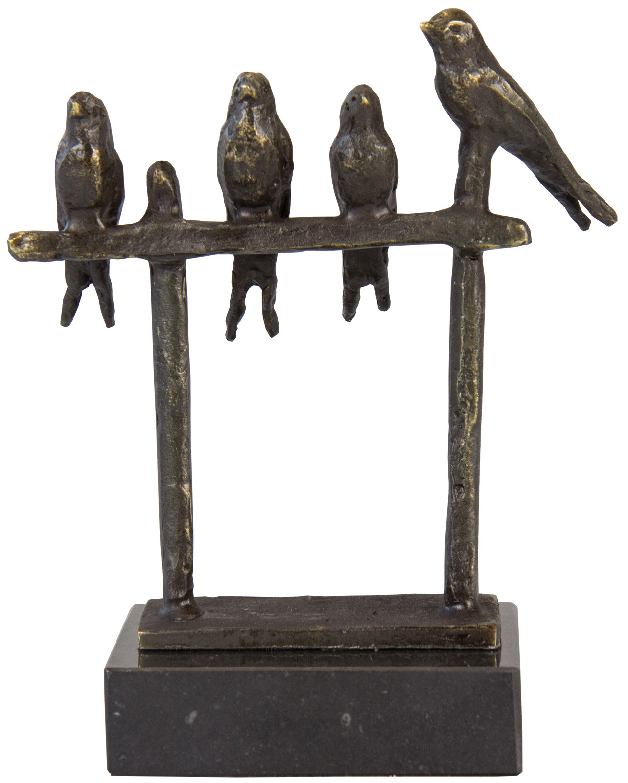 Fröhliches Vogel-Quartett hält Ausschau auf das nächste Ausflugsziel. Metallguss mit bronzierter Oberfläche auf schwarzem Marmorsockel. Format 14 x 11,5 x 5 cm (H/B/T). Gewicht ca. 530g.