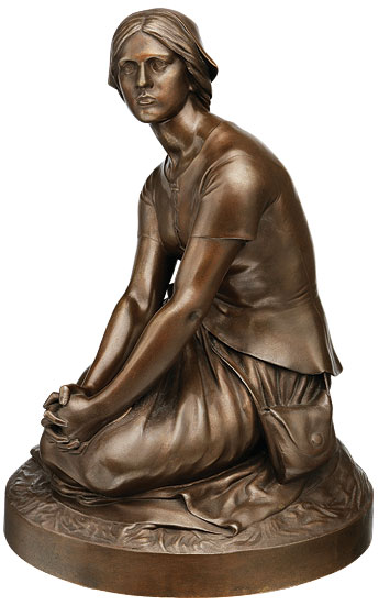 Die Hände gefaltet, sitzt sie da, gefasst - zart und sicher in die Weite blickend. Zuerst von der Inquisition angeklagt und unter widrigen Umständen hingerichtet, wurde Jeanne d'Arc (1412-1431) ein französischer Mythos. 1920 wurde sie von der Katholischen Kirche heiliggesprochen. Original: Marmor, Musée d'Orsay, Paris. Skulptur in Bronze. Gegossen im aufwendigen Wachsausschmelzverfahren, von Hand fein patiniert und poliert. Limitierte Auflage 199 Exemplare, nummeriert und signiert. Format 20,5 x 28,5 x 20,5 cm (B/H/T). Gewicht ca. 4,55 kg. Exklusiv bei ars mundi.