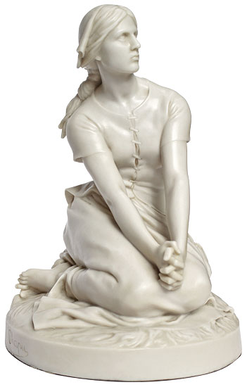 Die Hände gefaltet, sitzt sie da, gefasst - zart und sicher in die Weite blickend. Zuerst von der Inquisition angeklagt und unter widrigen Umständen hingerichtet, wurde Jeanne d'Arc (1412-1431) ein französischer Mythos. 1920 wurde sie von der Katholischen Kirche heiliggesprochen. Original: Marmor, Musée d'Orsay, Paris. Edition in Steinguss. Von Hand gegossen, patiniert und poliert. Limitierte Auflage 299 Exemplare, nummeriert und signiert. Format 20,5 x 28,5 x 20,5 cm (B/H/T). Gewicht ca. 4,5 kg. Exklusiv bei ars mundi.