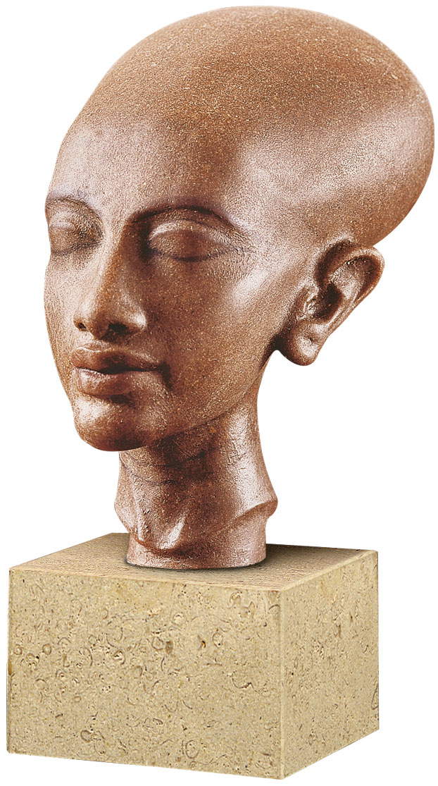 Zu den eigenständigsten Arbeiten der Amarna-Bildhauer gehören die aus Quarzit gehauenen Köpfe von Prinzessinnen, die durch ihre überlängte Schädelform auffallen. Medizinische Erklärungsversuche sind hier zum Scheitern verurteilt. In ihrer expressiven Ausdrucksweise zeugen diese Köpfe von der neuen Kunstrichtung unter Echnaton. Original: Quarzit, Ägyptisches Museum, Kairo. Ägypten, Neues Reich, 18. Dynastie, um 1350 v. Chr.Polymeres ars mundi Museums-Replikat von Hand gegossen, Höhe mit Muschelkalksockel 26 cm.