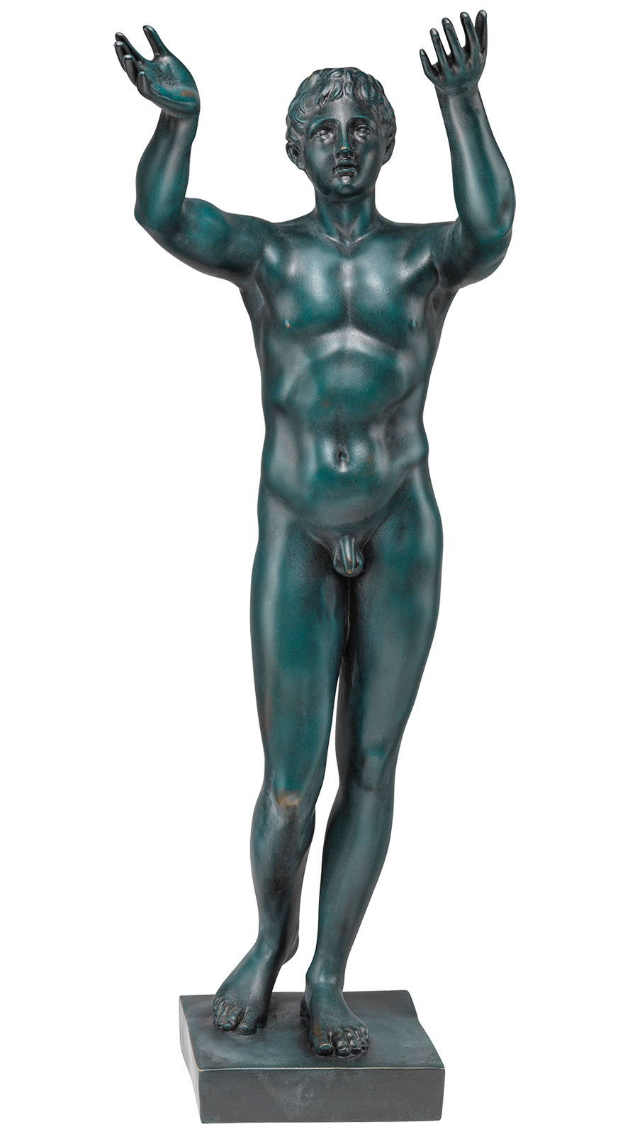 Der attische Bildhauer Leochares (375-310 v. Chr.), der am Mausoleum von Halikarnass eines der antiken sieben Weltwunder zu vollenden half, verwirklichte mit dem 'Betenden Epheben' das Ideal des gottähnlichen heroischen Olympioniken. Im geweihten Bezirk Diadumenos bei Olympia fiel der Glanz des ewigen Feuers auf den sich mit der Siegerbinde bekrönenden Jüngling. Die Arme weit über den Kopf erhebend, ruft er den Segen der Unsterblichen herbei. Original: Bronze, Staatliche Museen Preußischer Kulturbesitz Berlin, Pergamonmuseum. Leochares, um 320 v. Chr. Polymeres ars mundi Museums-Replikat, von Hand gegossen und von Hand patiniert. Reduktion, Höhe ca. 75 cm.